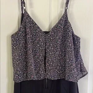 Elegant gray dress with a floral top. Perfect for any occasion.
