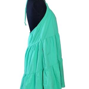 Chic green midi dress with halter neck. Features a stylish tiered design.