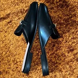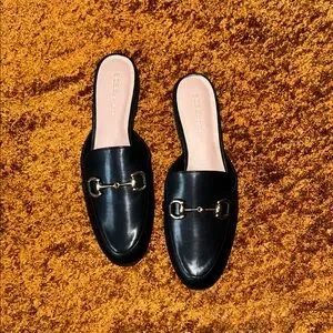 Chic black mules with elegant gold buckle details. Perfect for elevating any outfit.