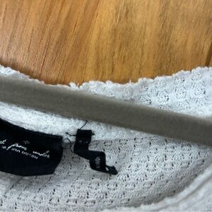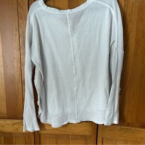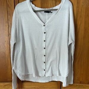 Chic white button-down with waffle knit texture. Features a V-neck and long sleeves. Perfect for versatile styling.