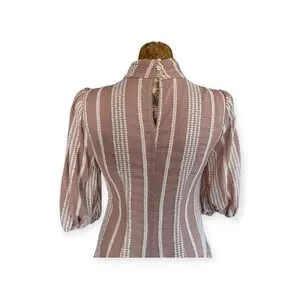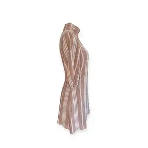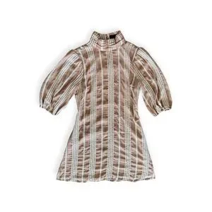 Chic mini dress with vertical stripes. Puff sleeves and high neckline. Perfect for stylish outings.