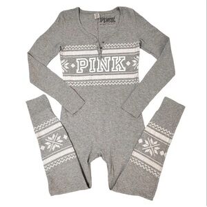 Get cozy in this hard-to-find collector's piece! ❄️ This is the sought-after Fall 2016 Limited Edition, VS PINK Thermal "Long Jane" One Piece Pajama. Featuring the classic grey Fair Isle holiday print & the iconic functional drop seat, this is the ultimate loungewear for winter.