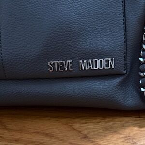 Elegant Steve Madden tote in a blue-gray shade. Features chain accents and dual handles. Perfect for daily essentials.