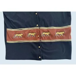Really great vintage cardigan sweater by Lisa International. Dark blue with design featuring puma or cheetah in gold. Gold buttons. Size medium. Really cool piece in great pre-owned condition!!!