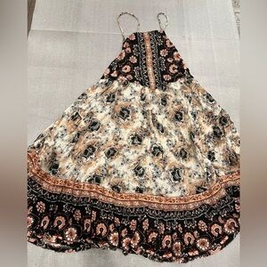 This elegant floral halter dress features a blend of black and cream colors, perfect for any occasion. The intricate floral pattern adds a touch of sophistication.