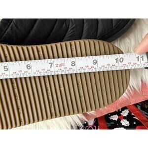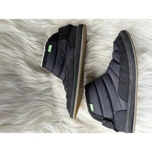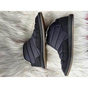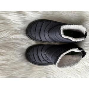 Comfortable black quilted booties by Sanuk featuring a warm fleece lining for added comfort. The boots have a durable sole with good traction, ideal for cold weather. Slight signs of use on the sole but overall in very good condition. Perfect for lounging casual winter wear.