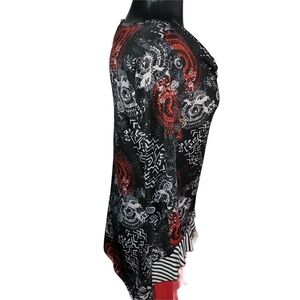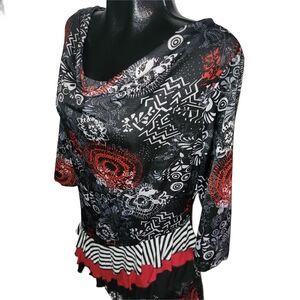 Stylish black and red women's top with a draped neckline by Le Grenier. Has layered ruffled detailed hemline and