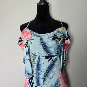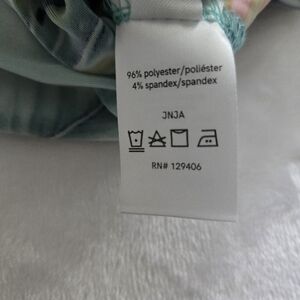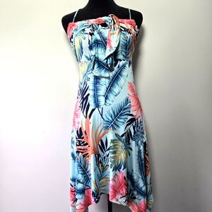 96% polyester, 4% spandex. Tropical sun and swim dress. Has a bathing suit feel. Adjustable spaghetti straps. Tie detail in front. Runched elastic back. Super comfortable, lightweight, and flowy. Perfect beach dress! Size XS. Also fits small.