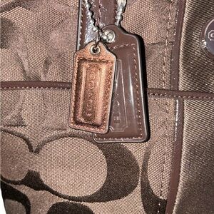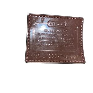 Matching leather Coach hangtag and a circular Coach medallion on the front.