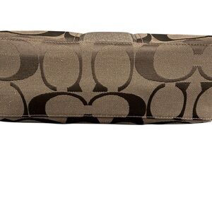 It features the classic mahogany and chocolate brown "Large C" jacquard monogram design with a distinctive central vertical stripe. Coach dust bag included.
