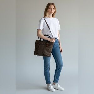 Materials: Signature jacquard canvas body with dark brown patent leather straps and silver-tone hardware.