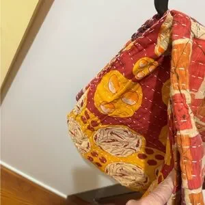 Kantha Vibrant blanket with a patchwork design. Features red, pink, and cream squares. Fits single bed perfectly