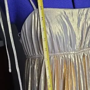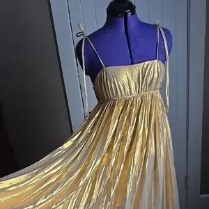 Elegant gold maxi dress. Features spaghetti straps and flowing design. Perfect for special occasions.