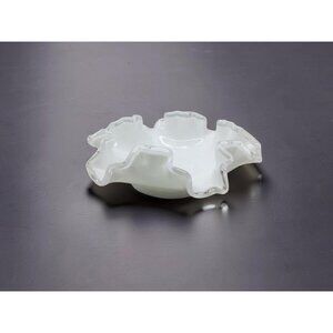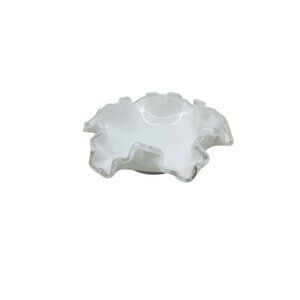 This vintage Fenton silver crest milk glass bowl showcases a ruffled edge, a testament to classic elegance and craftsmanship. Its pristine white finish and unique design offer a charming addition to any vintage collection, bringing a touch of nostalgia and sophistication to your home decor.