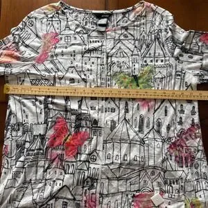 Ali Miles Womens L Tunic Top Butterfly Cityscape Print 3/4 Sleeve Art to Wear