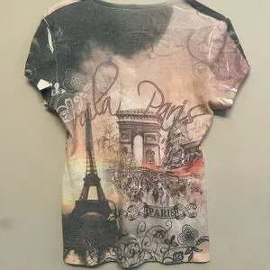 Say bonjour to your new favorite statement tee 🌸 — this Dressbarn Petite “Voila Paris” V-neck top captures the romance of Paris with a beautifully detailed print featuring the Eiffel Tower, Arc de Triomphe, and Parisian street scene, accented by sparkling rhinestones for that touch of glam.