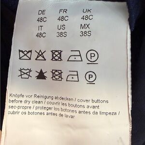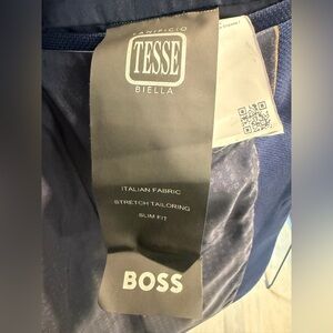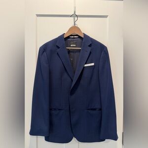 Refined style with Boss. Ideal for formal events or easily dressed down with jeans. Timeless blue hue. Integrated white pocket square can be flipped up or tucked in for less formal occasions. Excellent condition, worn/dry cleaned once.