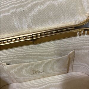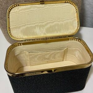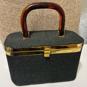 This sophisticated vintage JR ( Julius Resnick) Florida USA box style handbag features a black weaved fabric with lucite handle. Has gold/brass accents and clasp. Cream color taffeta lining.
