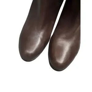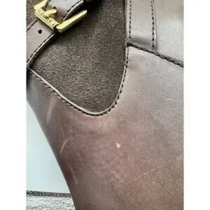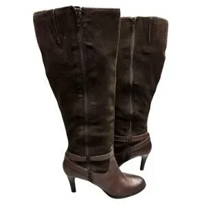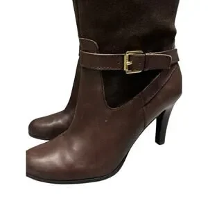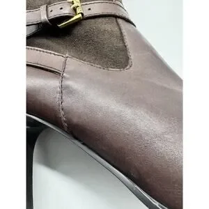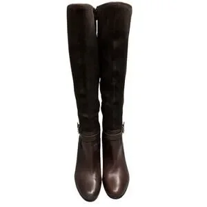 Lauren Ralph Lauren Bethan Chocolate Brown Knee High Stiletto Riding Boots. Beautiful boots with a stacked wool stiletto heel and gold tone buckle adjustment around the ankle. The upper leg portion of the boot is a nice pliable suede and the rest is classic leather. Features a side zip closure.