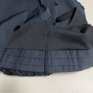 Very good condition. No rips or stains. Upper is stretchy knit fabric (black), lower (navy blue) thick satin like fabric. Very cute. 2 side inseam pockets and hidden side zip closure.