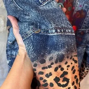 Make a bold statement with this denim blazer featuring a vibrant peacock print. The blazer is a jean design, but not actual Jean Material. Perfect for adding a touch of flair to any outfit. PTP: 22”. Length: 26”
