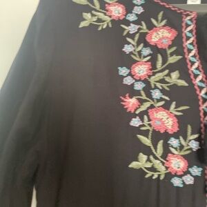 Adorable black babydoll dress with beautiful floral embroidered yoke, neck ties, and long puffed sleeves. Super flowy, drapey fabric and a retro style with major Free People vibes; this would look so cute with cowboy boots or some sneakers and is just the right weight to take you into Fall .