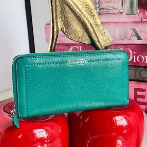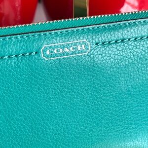 Elegant Coach wallet in turquoise leather. Features secure zip-around design. Ouside is like new condition super clean