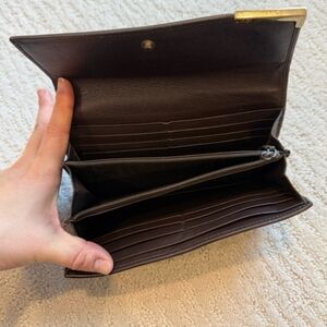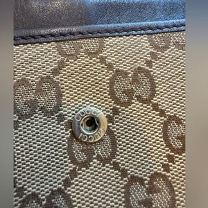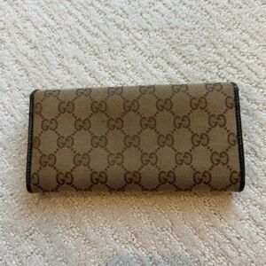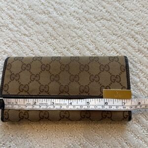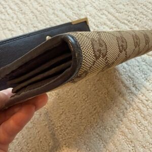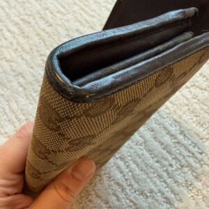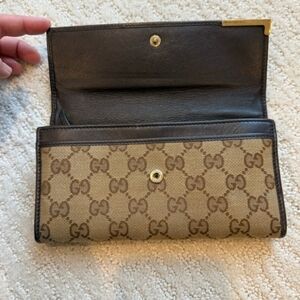 Gucci GG wallet. Canvas type material with brown leather trim. A few marks on the leather, as shown in photos. Gold Gucci plaque, has a few little marks as well. Leather interior with coin compartment and tight card pockets.