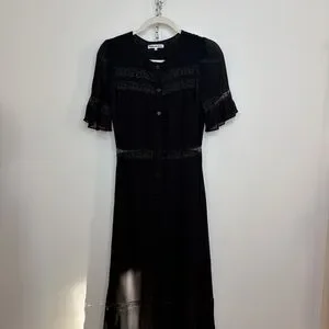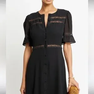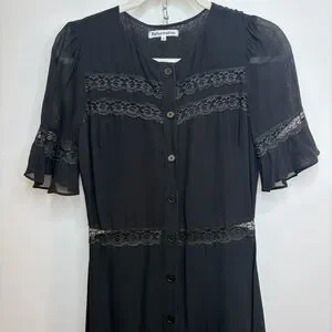 Chic black midi dress by Reformation. Features sheer accents and button-down front. Perfect for stylish outings.