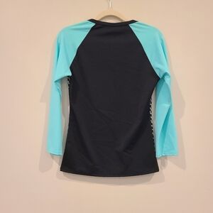 Excellent condition swim top, black and white dot print with aqua colored sleeves. In excellent preloved condition