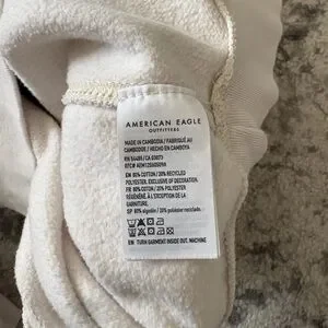 Cozy American Eagle crewneck sweatshirt in a soft beige color with bold green “AMERICAN EAGLE” chenille logo across the chest. Made from 80% cotton and 20% recycled polyester for a warm, comfy feel. Features ribbed cuffs and hem with a relaxed, slightly cropped fit.