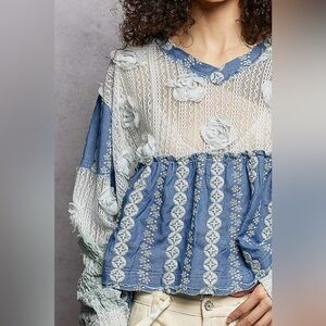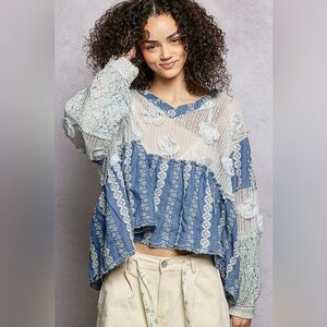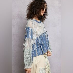 Chic lace blouse with floral accents. Features blue and cream tones. Perfect for stylish outings.