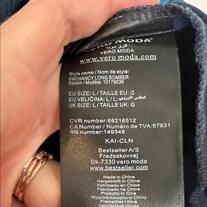 Stylish navy bomber jacket by Vero Moda. Features a sleek design with a front zipper. Perfect for casual wear. Lightweight