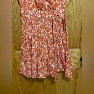 Step out in style with this chic floral wrap midi dress. The vibrant red and white pattern adds a touch of elegance, perfect for any occasion.