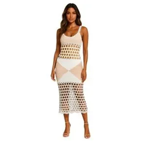 Open knit through back, midriff, and calf area, but close knit everywhere else. This would be beautiful on an island vacation! Wear it as a swanky swim cover during the day, then throw on some strappy sandals for dinner by the beach! Also a cute festival outfit..