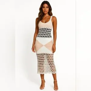 Handmade Crochet Macrame Knit Crochet Dress Midaxi Swim Cover Cream Tan Sz S