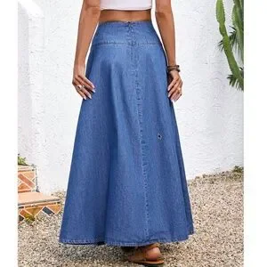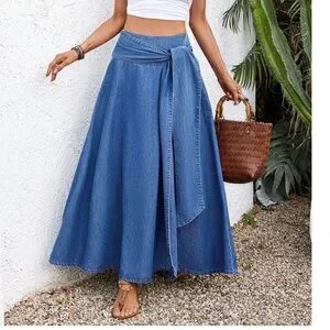 Medium Wash High Waisted Tie Belt Denim Jean Maxi Skirt