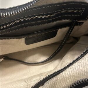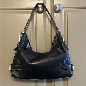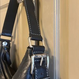 Black Michael Kors shoulder bag with silvertone hardware and cream topstitching. Measures 13”x 10”x 1 1/2”. Some of the hardware is a little scratched. See photo. Otherwise, great condition. Interior has multiple pockets and compartments.