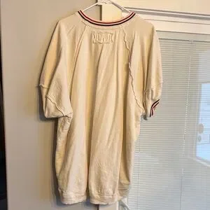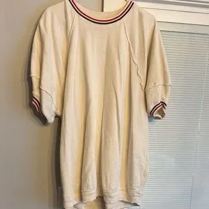 Casual cream tee with short sleeves. Features a striped neckline. Perfect for everyday wear.