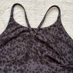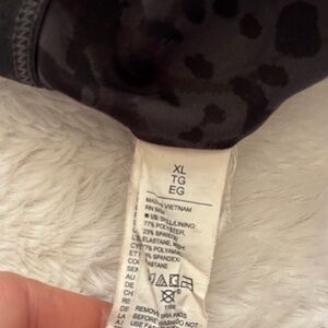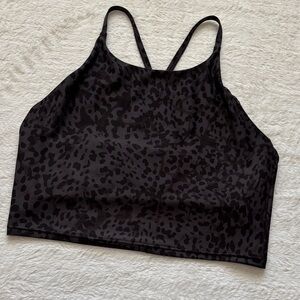 Cute black leopard print crop top for working out or running errands. Has a built in bra but no pads. You could add your own though if you wanted from another bra or something. Features a sleek design with thin straps. Straps are not adjustable Size XL great condition