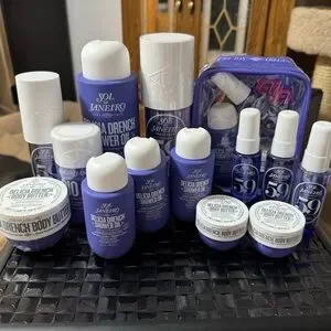 Sol de Janeiro Delicia Drench Cheirosa 59 bundle. Picture one shows all items in the lot. Picture two shows the caps off of items that are open. Pictures three and four show fill lines of the mist items that are open. Small shower oil has about 50 to 75% product left. Large shower oil has 90 to 100% of product left. I bought all items from Sol de Janeiro‘s website, except for the jet set. The jet set was bought from an online seller before the cheirosa 59 jet set was widely released on Sol de Janeiro‘s website. In the jet set the shower oil has seal intact, body butter has protective barrier intact, mist is unsealed. I do not know if the mist is sealed in the jet set sold on Sol de Janeiro’s website. I am not a fan of this fragrance. Items are sold as is with no returns, no boxes. Comes from a smoke free home but not a pet free home. There may be pet hair on the items or the packaging it’s wrapped in. ***PRICE IS FIRM***added up on Sol de Janeiro‘s website this would cost $237.