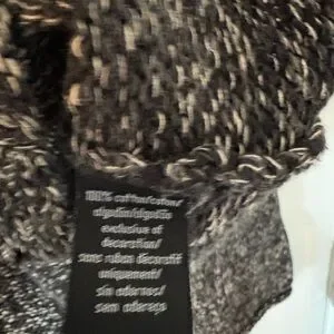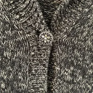 Calvin Klein Jeans marled knit cardigan in a black, gray, and cream blend. Features a flattering shawl collar neckline and a gorgeous jeweled statement button closure that gives it a subtle dressy touch.