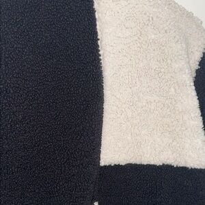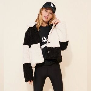 Chic and warm teddy jacket. Features bold black and white design. Ideal for layering and style.