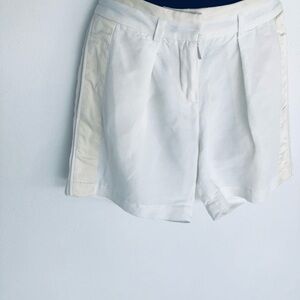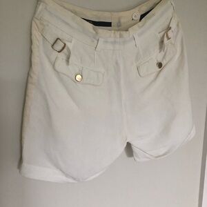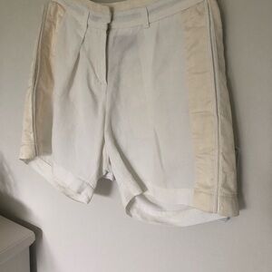 Chic white shorts with cream silk side panels and gold accents at the back pockets by Roberto Cavalli. Ideal for a refined look.