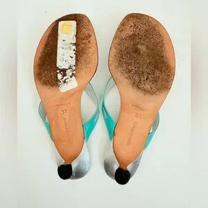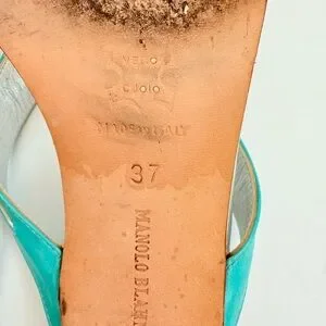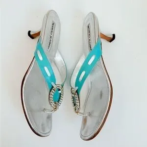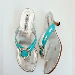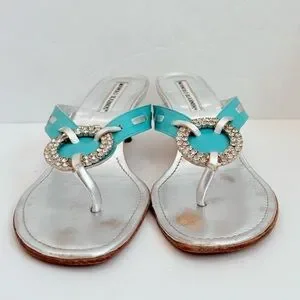 Manolo Blahnik Silver Turquoise Leather Vintage crystal thong sandals EU37 US 7