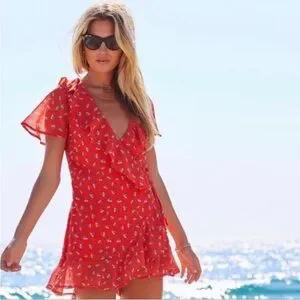 Step into elegance with the Beach Riot Red Orange Ruffled Wrap Sundress, perfect for wedding guests or cocktail events. This mini dress features a flattering v-neckline, flutter short sleeves, and a tie front that accentuates the waist. The vibrant red hue and cascading ruffles add a touch of romance and movement to your look.
