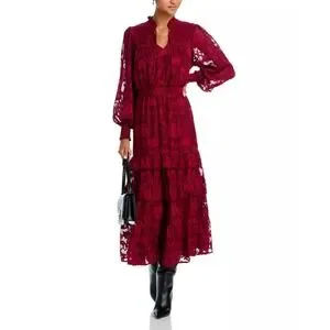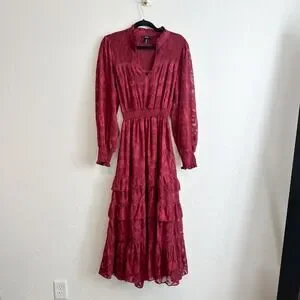 AQUA | Yvonne Jacquard Lace Tiered A-Line Dress in Wine | Small