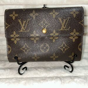 Chic Louis Vuitton clutch with signature monogram. Rich brown leather with gold accents.