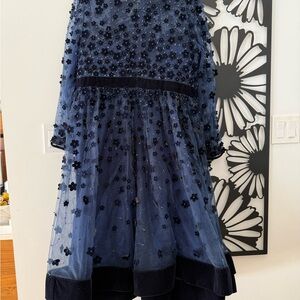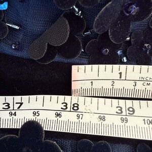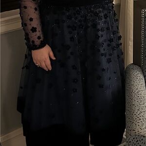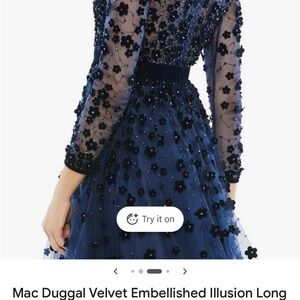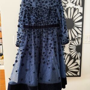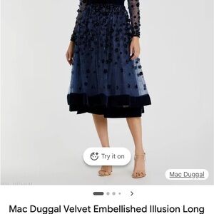 Formal tea length dress by Mac Duggal. Midnight blue with floral appliqué embellishments. Ideal for formal event. I am 5’2” and the length was just below my calves and my weight was 195-200 lbs. The dress has a satin lining and the skirt portion has 2 layers of mesh fabric that slightly flare at bottom. Included stock photos. Such a beautiful dress in classic navy blue.