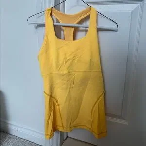 Lululemon sleeveless athletic tank in a bright yellow shade with a flattering racerback design. Features built-in bra support with mesh lining for breathability and comfort. Designed for training, yoga, running, or everyday athleisure wear.